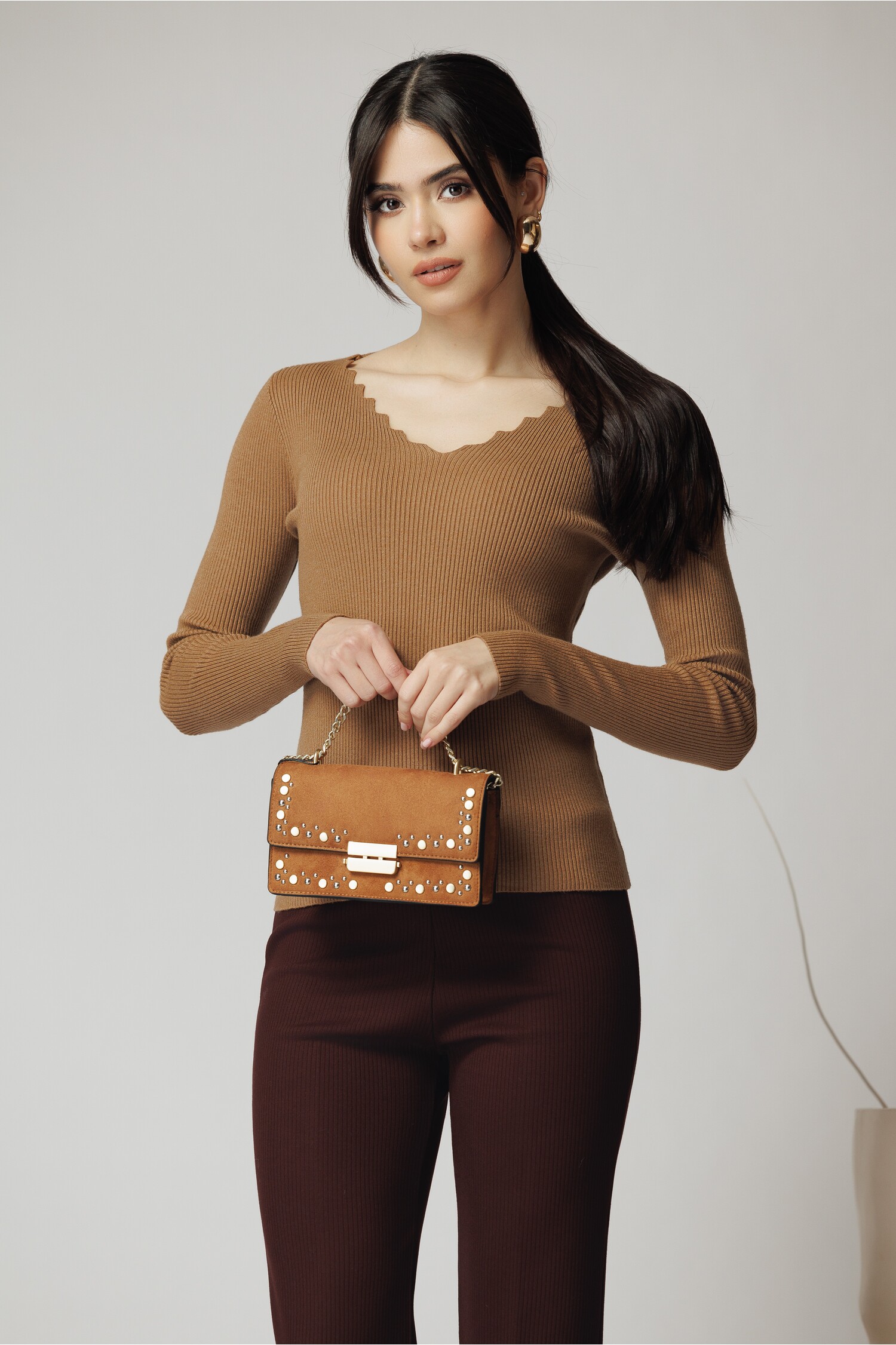 Redescoperă eleganța simplă și confortul de zi cu zi cu bluza noastră casual din tricot. Nuanța caldă de maro deschis și designul modern cu decolteu în V și model zig-zag te vor transforma într-o prezență rafinată, indiferent de ocazie. Este piesa perfectă pentru un look chic și relaxat.