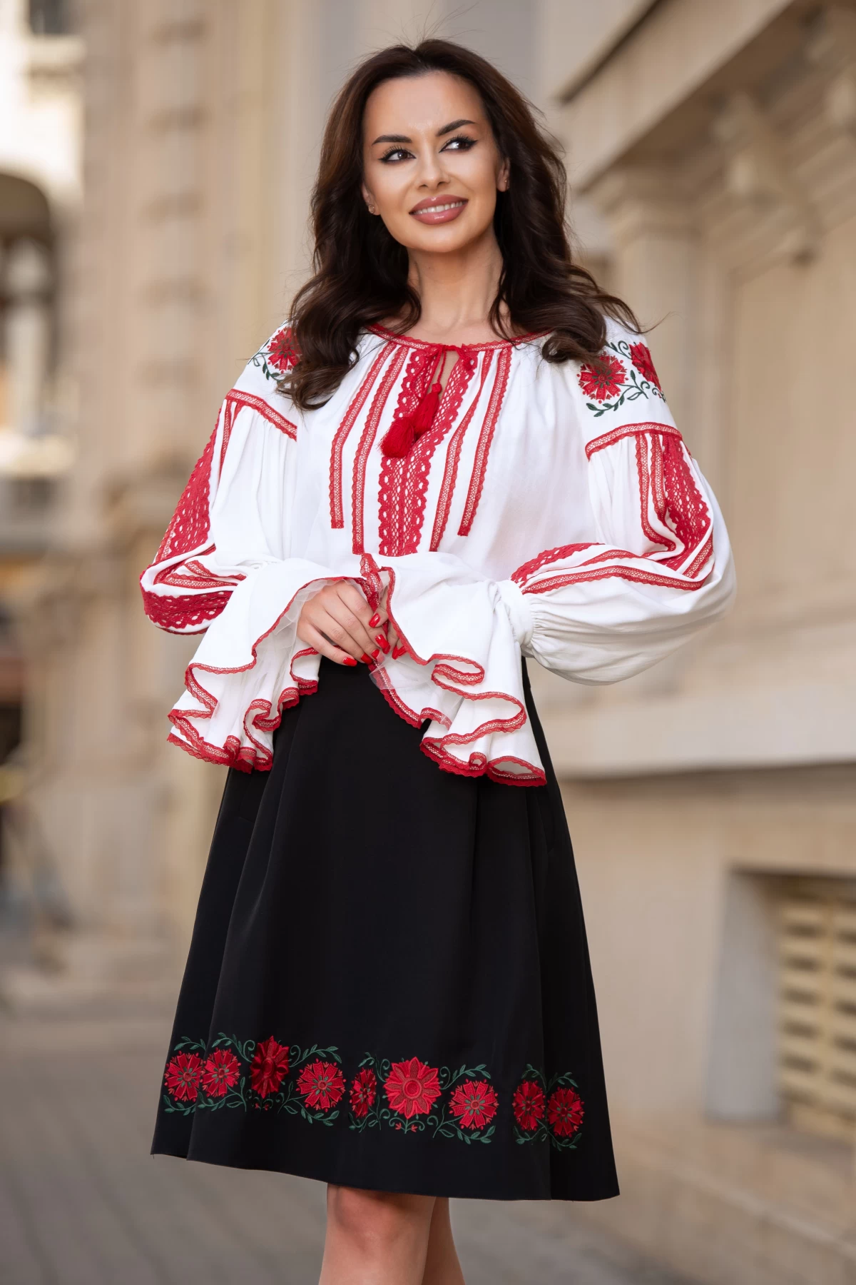 Cumpără bluza tip ie albă cu broderie roșie de la Effect. Model elegant, fabricat în România. Adaugă în coș!