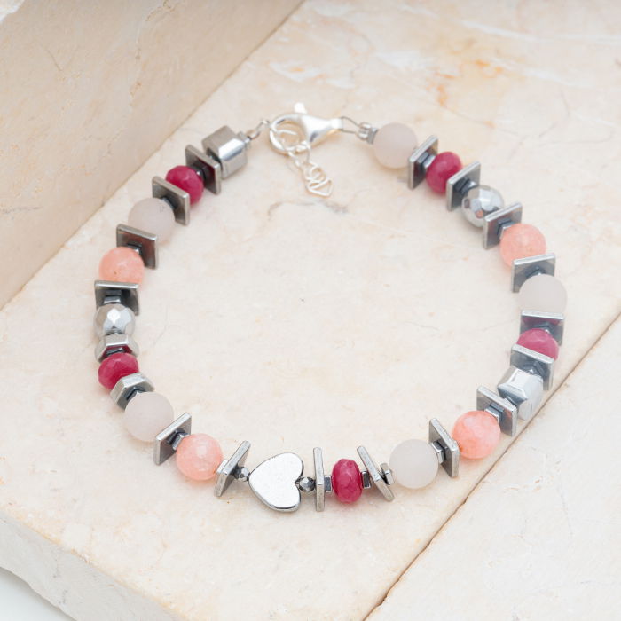 Descopera bratara handmade cu cuart roz, agate si hematit. Bijuterie eleganta din argint, livrata in cutie cadou. Comanda acum!