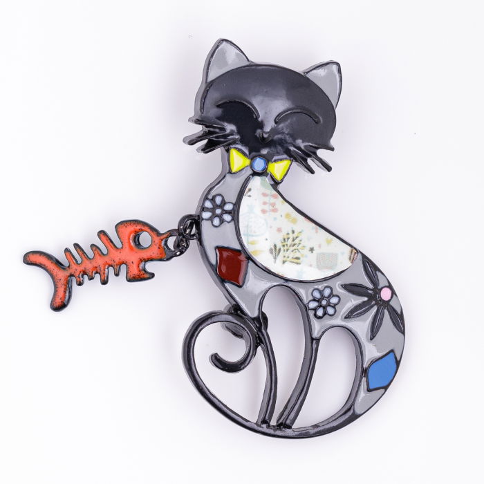 Adaugă o notă de mister și eleganță jachetei tale cu brosa metalică Shopika. Designul original, ce înfățișează o pisică neagră cu un peștișor atârnat la gât, este o declarație de stil plină de farmec și personalitate, perfectă pentru iubitoarele de animale și a accesoriilor unice.