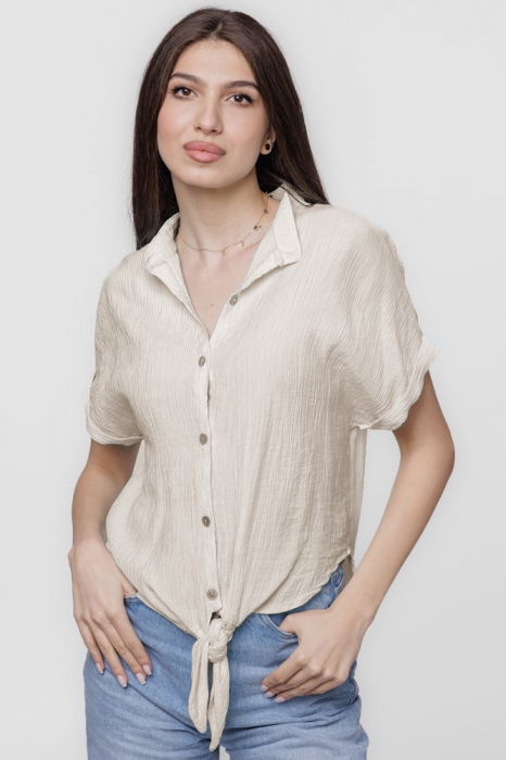 Descoperă eleganța rafinată a cămășii bej din vascoză creponată Shopika, o piesă versatilă ce îmbină confortul cu stilul modern. Designul său unic, cu guler tunică și nod frontal decorativ, te va transforma în centrul atenției la orice ocazie.