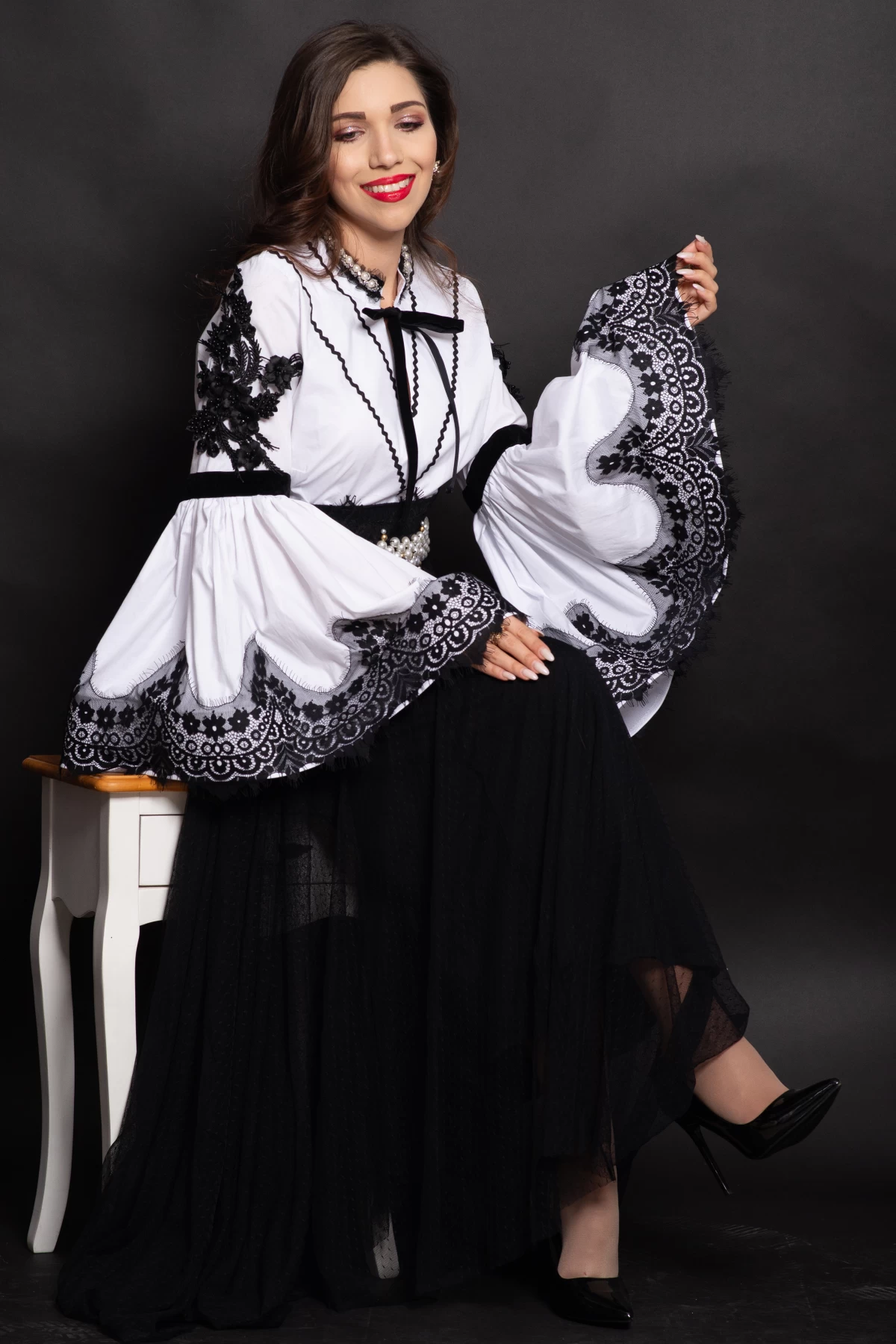 Descopera camasa Elizabeth Inpuff cu broderie neagra si maneci clopot. Piesa traditionala eleganta perfecta pentru evenimente speciale. Comanda acum!