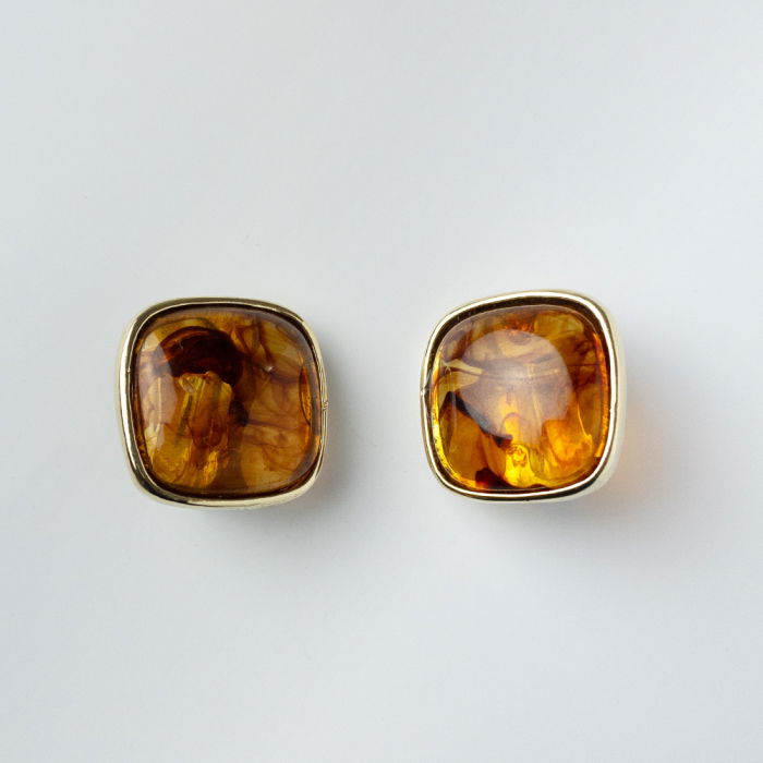 Cercei clips aurii cu design patrata și chihlimbar de la Shopika. Perfecte pentru un look elegant fără găurire. Adaugă în coș!