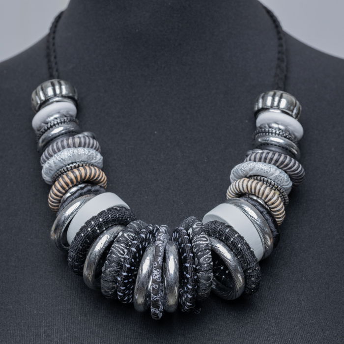 Colier gri-negru Shopika cu anouri din lemn și metal. Design elegant și modern. Comandă acum la 89.99 RON!