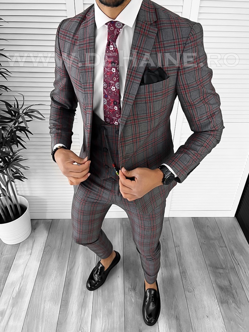 Costum barbati slim fit gri in carouri, perfect pentru office, nunti si evenimente speciale. Comanda acum la pret avantajos!
