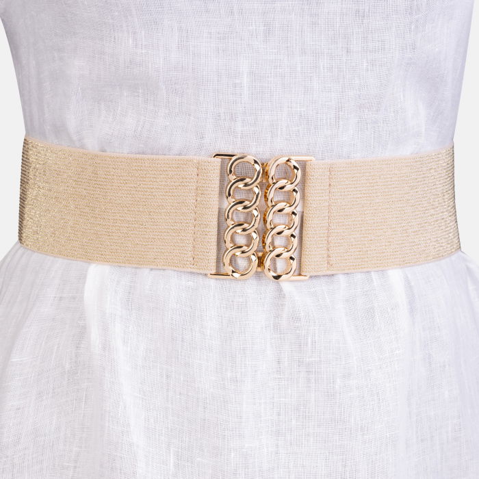 Descoperă curea lata aurie cu tesătură de lurex de la Shopika. Elastică, cu cataramă aurie, perfectă pentru a-ți defini talia. Adaugă în coș!