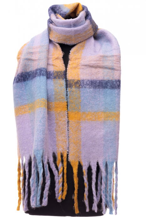 Descoperă eleganța și versatilitatea acestui fular cu imprimeu carouri în nuanțe rafinate de lila, galben și bleumarin. Perfect pentru a-ți completa ținutele de toamnă-iarnă cu un touch de stil și căldură.