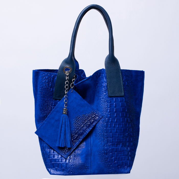 Geanta shopper Shopika în albastru electric, din piele intoarsă naturală. Include portofel și ciucure asortate. Adaug-o în coș!
