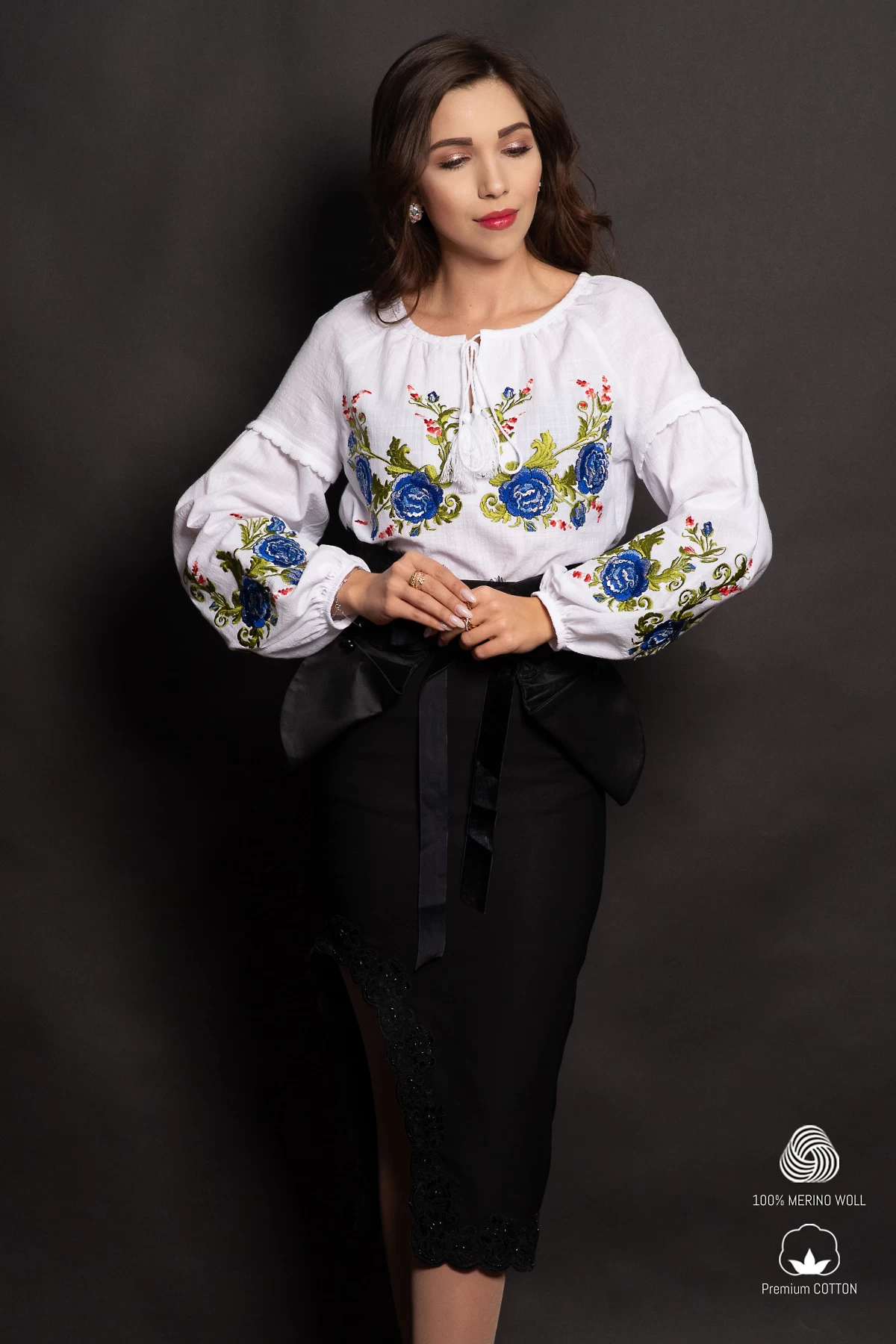 Descoperă ie-ul Lehel cu trandafiri albaștri brodați. Bumbac 100% natural, design exclusiv. Cumpără acum!