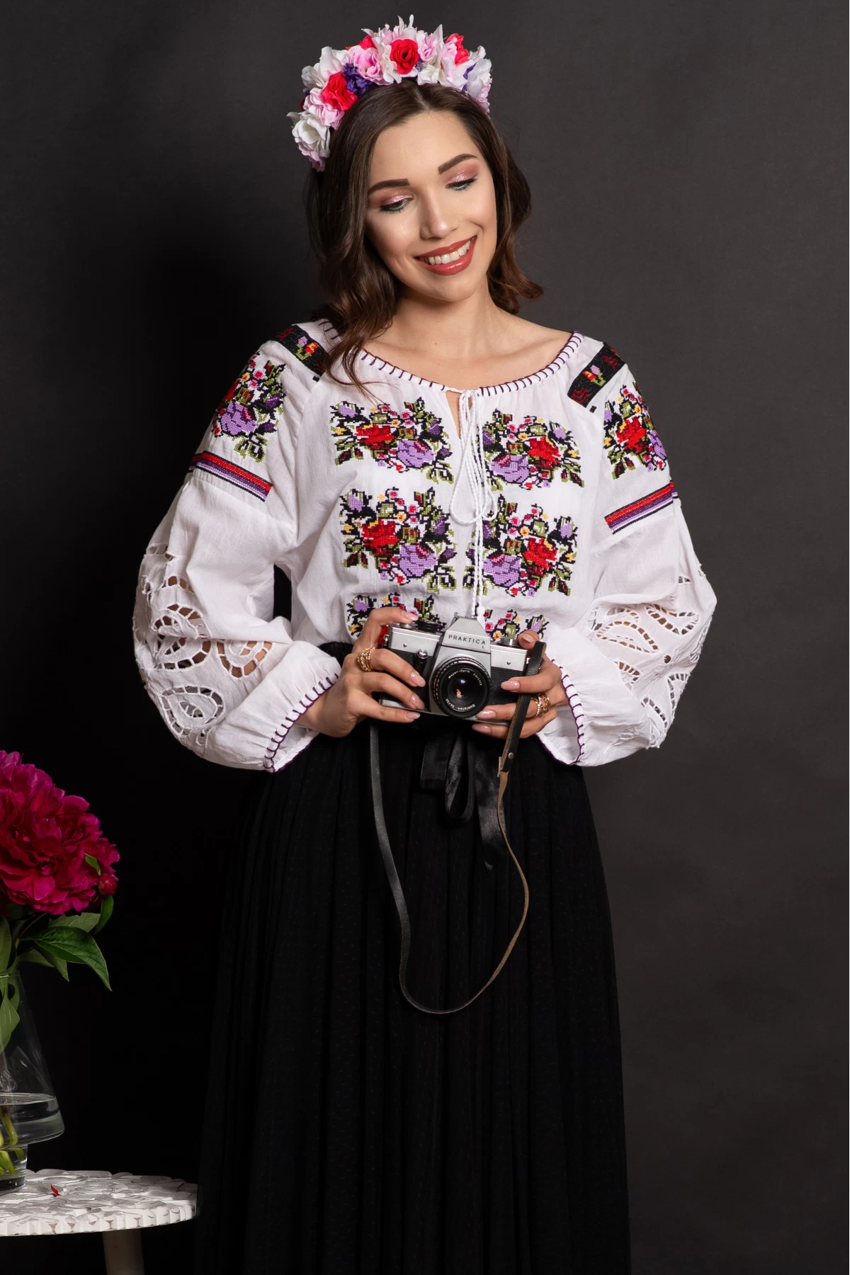 Descopera ia traditionala Sidonia cu maneci perforate si broderie florala. Cumpara acum piesa unica din 100% bumbac!