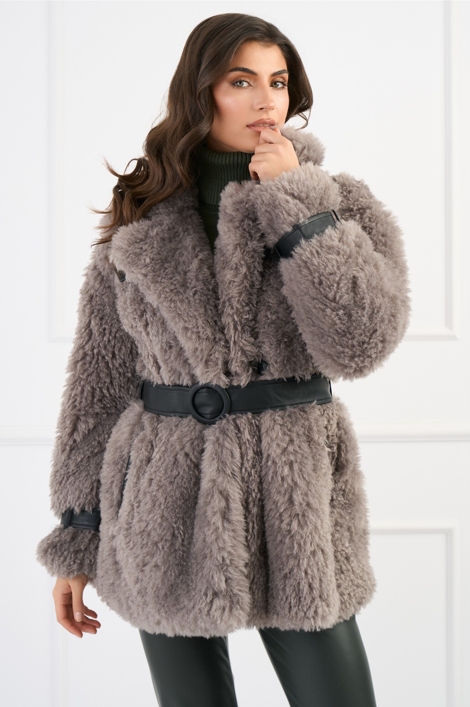 Descopera jacheta eleganta din blana gri cu insertii piele ecologica. Design modern cu cordon detasabil. Comanda acum!