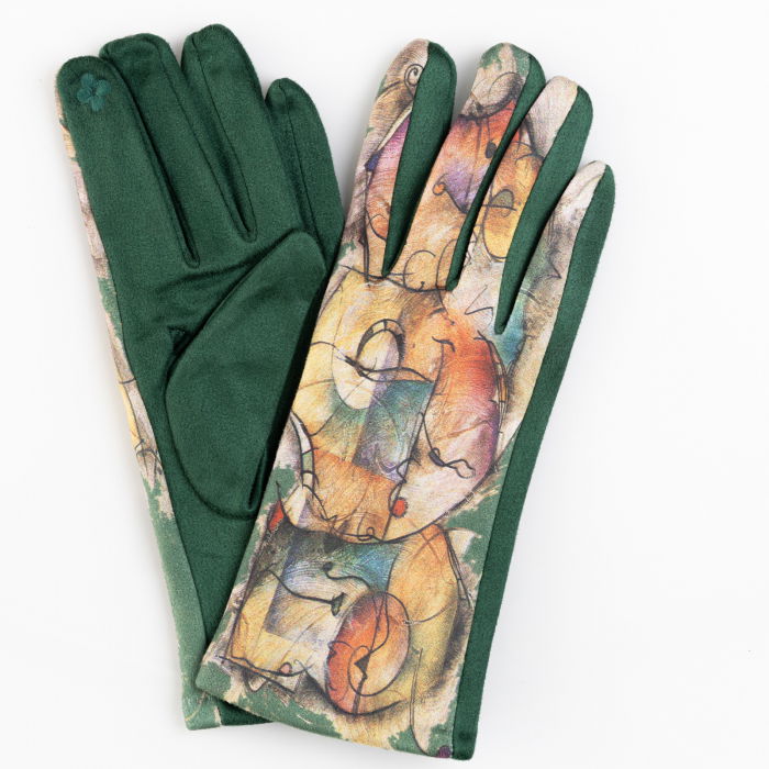 Descoperă mănușile dama Shopika cu imprimeu abstract pe fond verde. Material catifelat și compatibile touchscreen. Comandă acum la preț promo!
