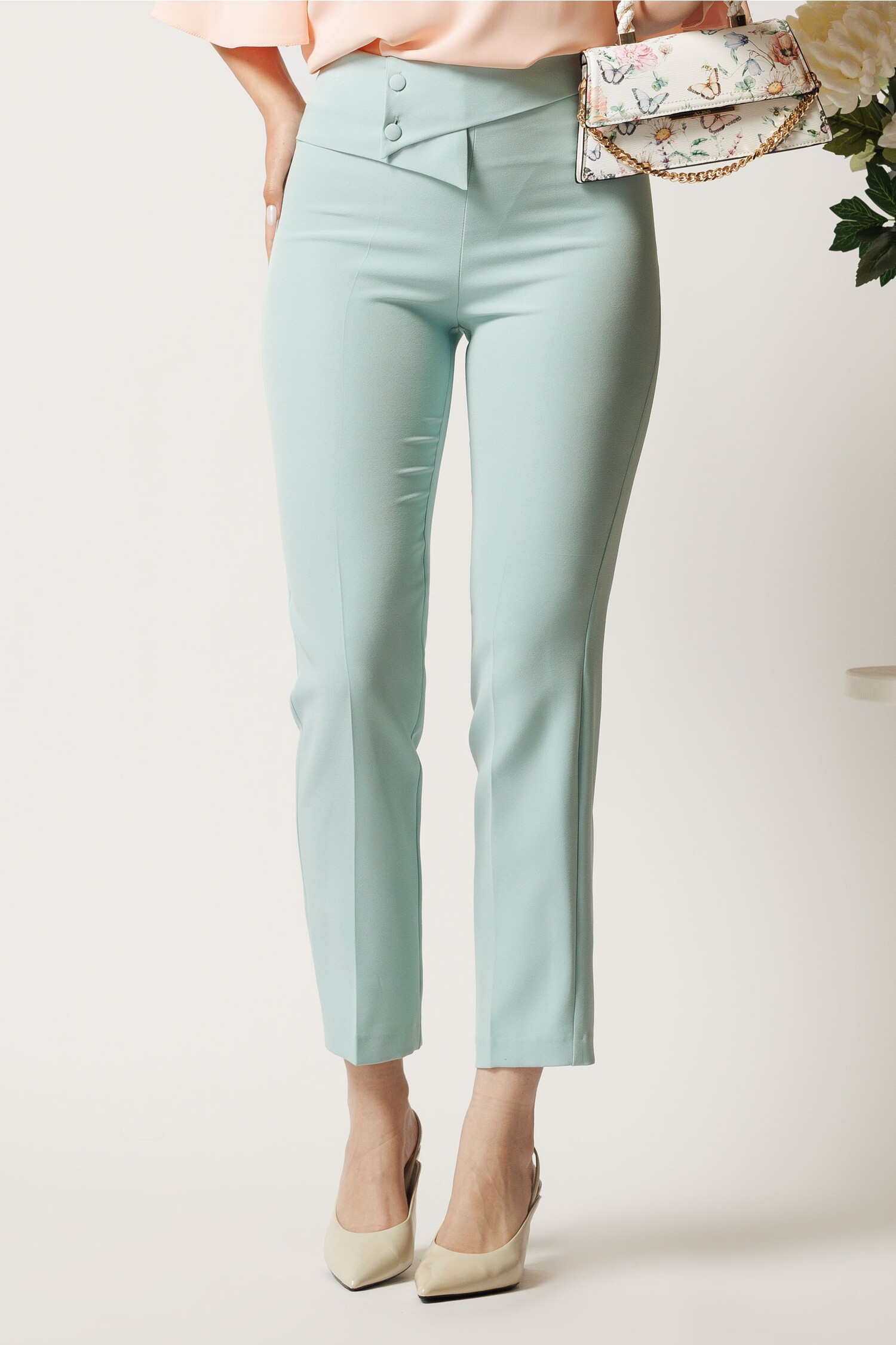 Descoperă pantalonii din stofă conici, verde mint, cu talie înaltă. Ideal pentru un stil office elegant. Adaugă în coș!