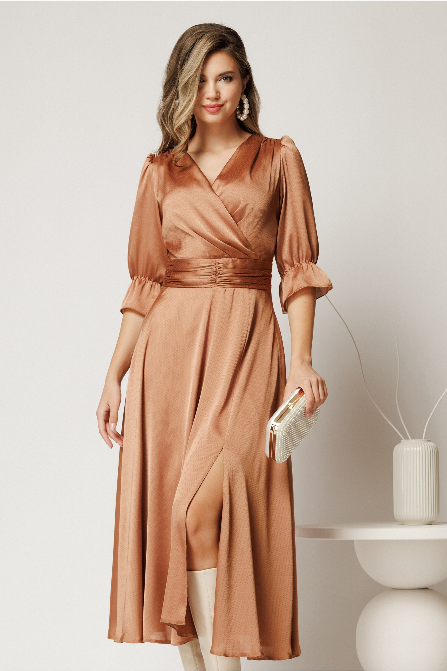 Rochie midi bej din voal cu decolteu petrecut și crăpătură, perfectă pentru cununia civilă. Comandă acum și strălucește!