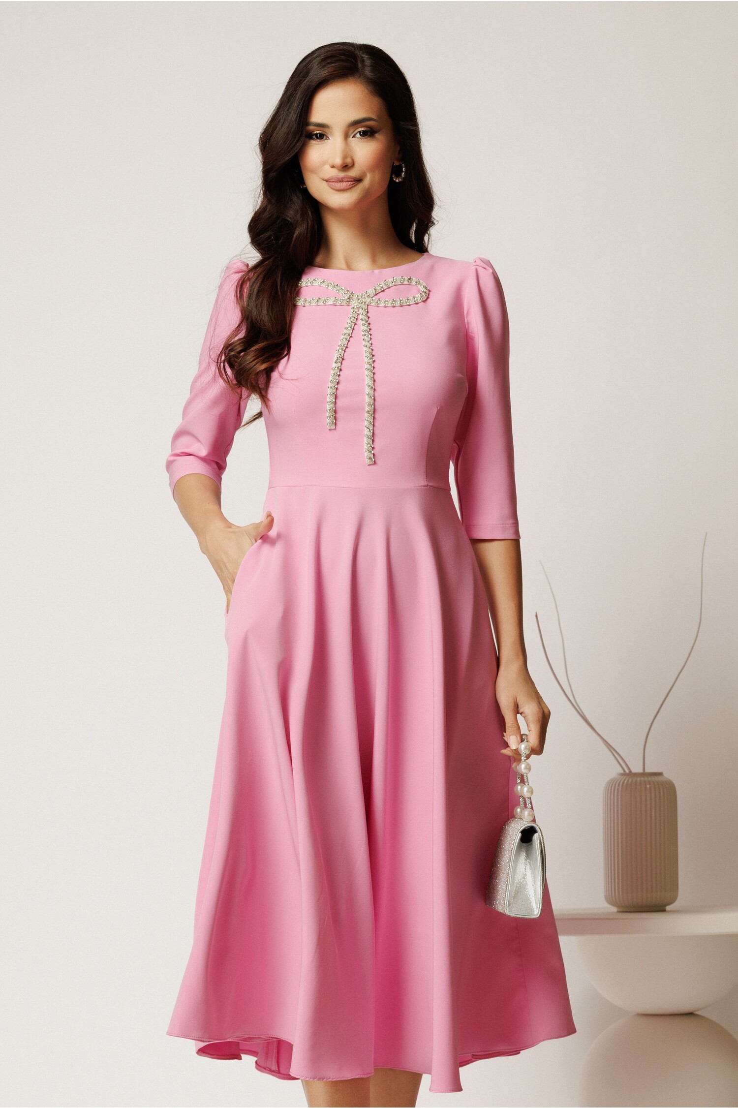 Descoperă rochia midi roz din stofă cu fundă și strasuri pe bust. Cumpără acum și adaugă eleganță în garderoba ta!