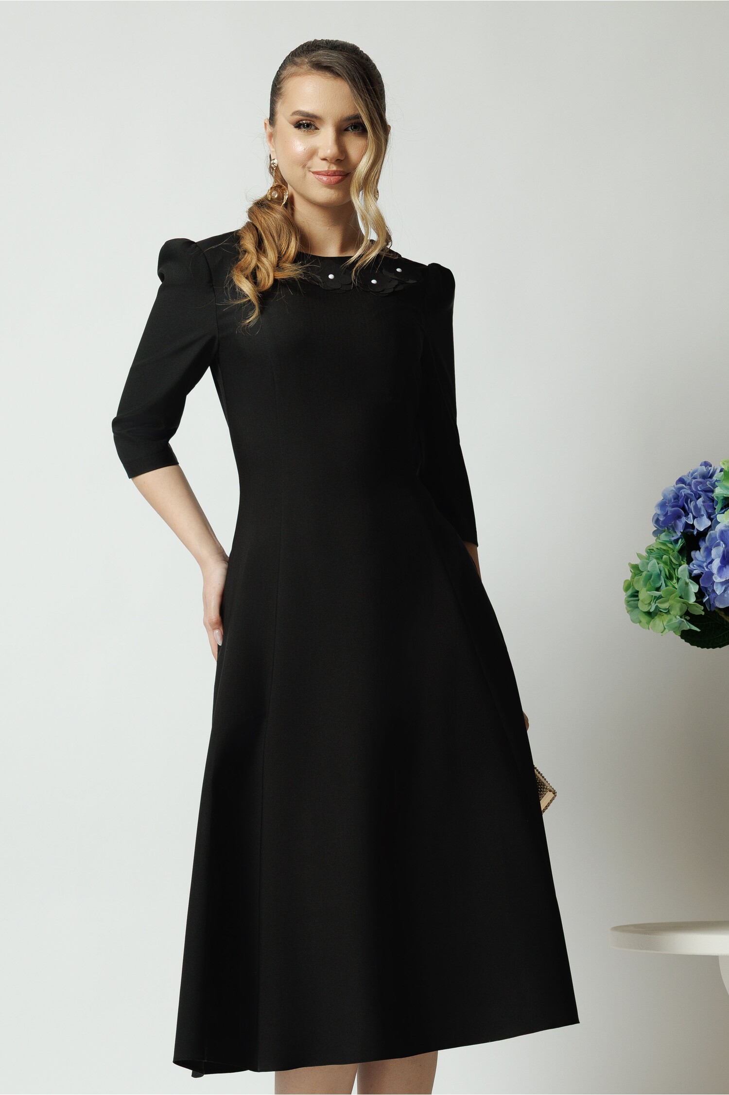 Descoperă rochia office neagră din stofă cu flori la bust. Croi clos, buzunare funcționale și design elegant. Comandă acum!